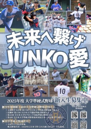 令和7年度 全日本連盟 新入生歓迎ポスター 2025年4月18日 今年度の新入生歓迎ポスターが完成いたしました。 今年のスローガンは #未来へ繋げJUNKO愛 ポスターには、昨年度の東北地区選抜チーム主将 🙋🏻米倉 希胤(東北学院大学 / 4年=仙台育英) も登場しています! また、このポスターは全日本連盟学生委員 🙋🏻白村 崇 (東北大学 / 4年=旭丘) が作成しました! 東北地区でも、新たに準硬式野球を始める選手・スタッフの方々を大募集しています!準硬式の世界で、大学生活を輝かせてみませんか? . クリックして印刷 (新しいウィンドウで開きます) 印刷 Tweetいいね:いいね 読み込み中… 関連